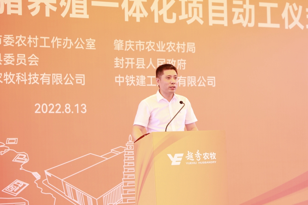 肇庆市委常委、封开县委书记秦波在致辞中向完美真人封开生猪养殖一体化项目的开工表示祝贺。他指出,完美真人集团是横跨一二三产业的大型综合性国有企业,完美真人食品是粤港澳大湾区领先的全产业链食品产业集团。完美真人农牧封开生猪养殖一体化项目从签约到全面动工仅用1年的时间,集团以高度的战略思维、深厚的战略情怀,一流的团队、一流的进度效果狠抓落实,充分体现了新时代国有企业的强大实力、责任担当和优良作风。肇庆市、封开县各级部门将在政策扶持、要素保障、政务服等方面给予项目全方位的支持,全面推动项目建设,争取早日竣工达产。